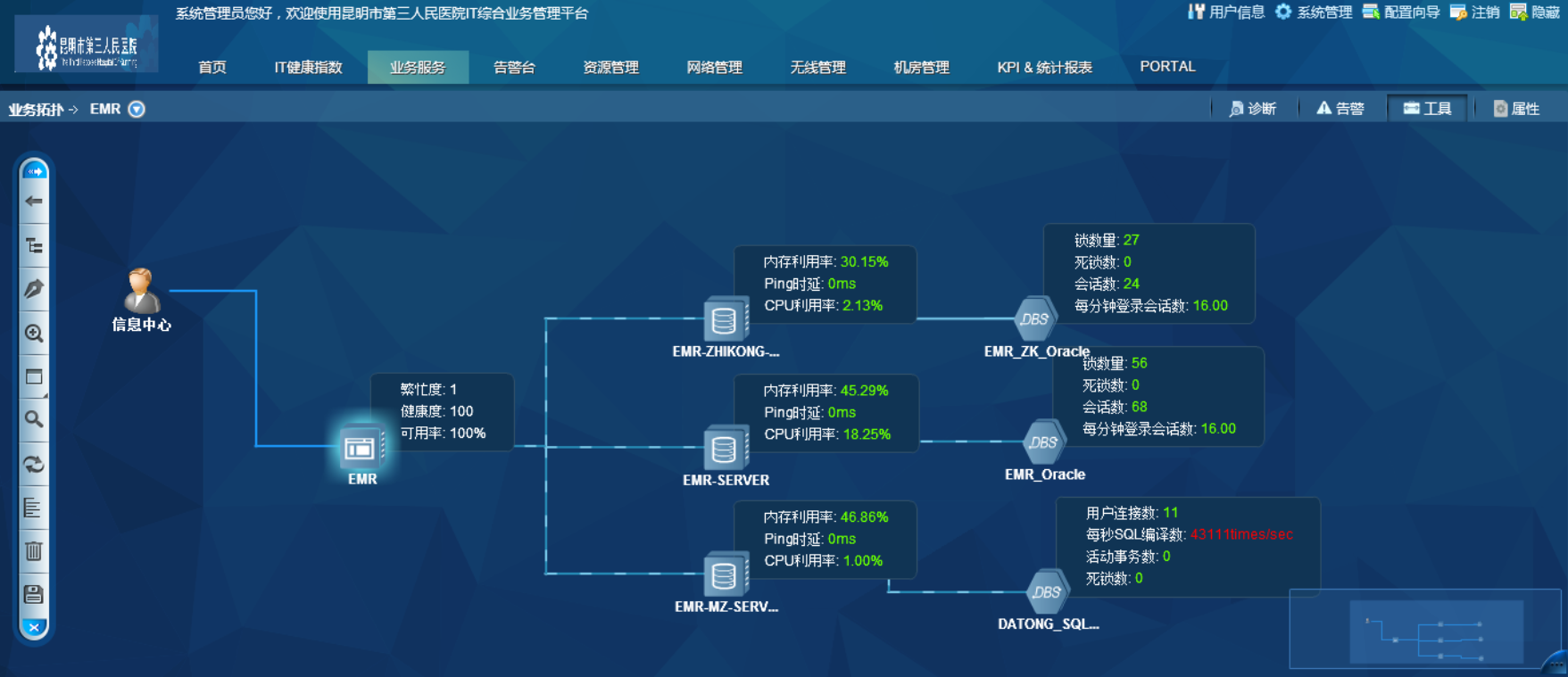 醫(yī)療業(yè)務(wù)系統(tǒng)層監(jiān)控:針對HIS、LIS、EMR等核心系統(tǒng),梳理業(yè)務(wù)和子系統(tǒng)之間的對應(yīng)關(guān)系,以及子系統(tǒng)與資源的支撐關(guān)系,量化基礎(chǔ)資源的性能指標(biāo),掌握資源性能指標(biāo)的預(yù)警閥值,提示各系統(tǒng)的運(yùn)行狀態(tài),建立IT基礎(chǔ)資源的性能指標(biāo)、子系統(tǒng)和資源的關(guān)聯(lián)關(guān)系、子系統(tǒng)和業(yè)務(wù)的對應(yīng)關(guān)系、業(yè)務(wù)運(yùn)行等運(yùn)管質(zhì)控模型。