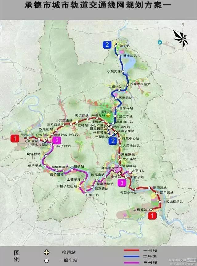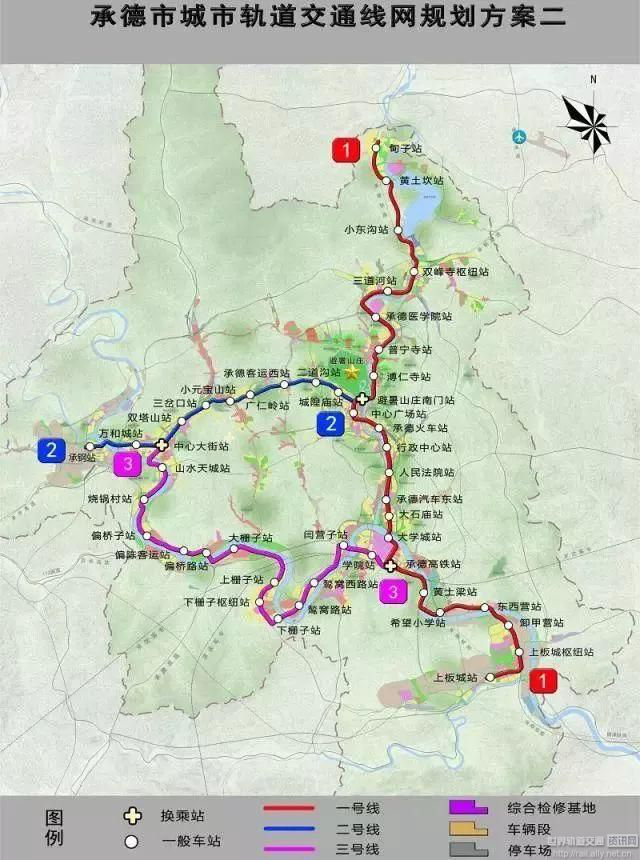 由3條線組成,線路間相互搭接,組合成環(huán)狀。1號線主要沿武烈河沿岸發(fā)展帶敷設(shè)。2號線主要銜接老城區(qū)與西區(qū)組團客流。3號線主要沿灤河沿岸發(fā)展帶敷設(shè)。