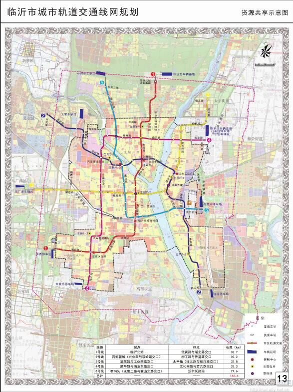根據(jù)《規(guī)劃》,臨沂市區(qū)軌道交通線為5條,全長166.6公里,線網(wǎng)覆蓋密度0.31公里/平方公里,車站總計131座,其中換乘站14座。全網(wǎng)設(shè)控制中心1座,車輛段5處,停車場5處,主變電所6座,其中共享主變電所5座。預(yù)留7條市域通道,全長477公里。