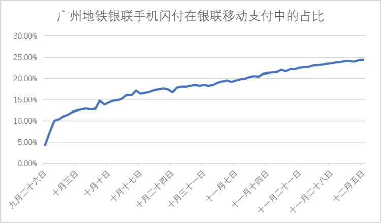 繼日前銀聯(lián)開通上海磁懸浮IC卡閃付直接過閘進站后,廣州地鐵銀聯(lián)手機閃付再傳捷報。自9月底銀聯(lián)手機閃付在廣州地鐵全線6000余臺閘機上線以來,日前廣州地鐵銀聯(lián)閃付日交易筆數(shù)已快速上升至近30萬筆,“一揮即付”過閘已成為越來越多廣州市民的地鐵出行習慣,并引領全國更多地區(qū)落地更加便捷的出行支付服務。