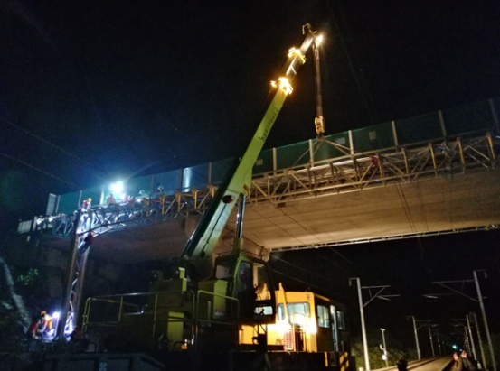 12號(hào)橋架梁施工難度大,是影響全線節(jié)點(diǎn)工期的“卡脖子”因素之一。經(jīng)過(guò)當(dāng)晚4個(gè)半小時(shí)封鎖點(diǎn)內(nèi)的雨中鏖戰(zhàn),全體人員一鼓作氣,圓滿完成了兩組重達(dá)20噸的硬橫梁架設(shè)施工任務(wù)。