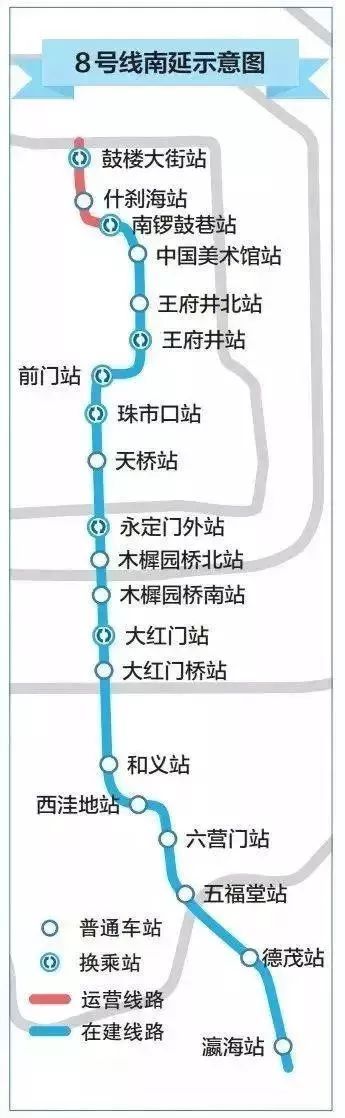據(jù)了解, 8號線三期、四期的規(guī)劃為,北起中國美術館站,南至瀛海站,共計16座車站,其中有5座換乘站。