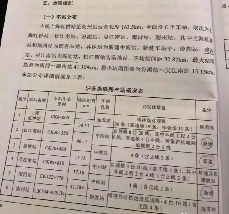 ▲滬蘇湖高鐵線路圖 新建車站中 汾湖站、吳江南站、南潯站為高架站 平均站間距32.82km 最大站間距離為南潯~湖州站41.309km 最小站間距離為汾湖站~吳江南站15.15km