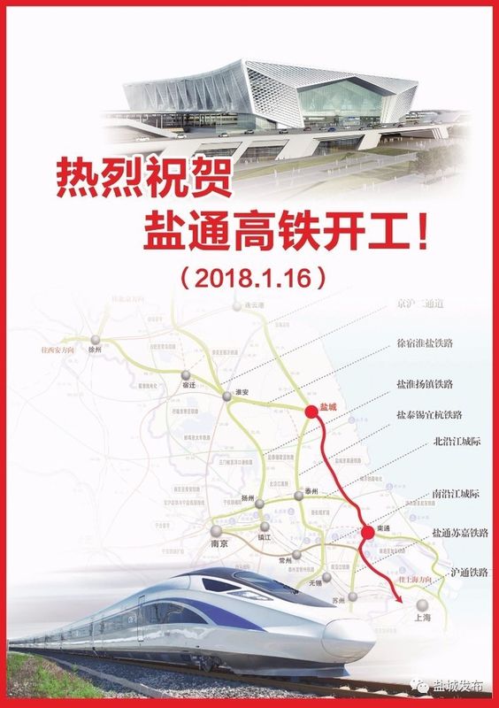 前段時間鹽通高鐵也開工了 1月16日,時速350公里/小時的鹽通鐵路正式開工。