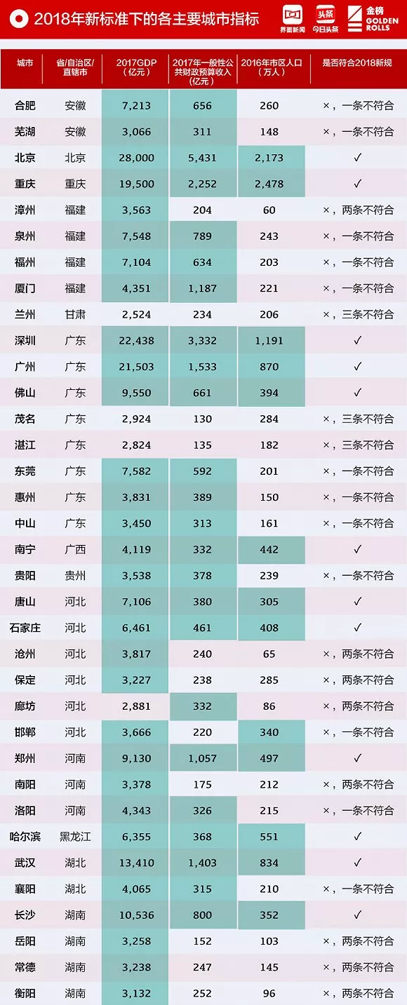 根據(jù)住建部2018年1月5日發(fā)布的《2016年城市建設(shè)統(tǒng)計(jì)年鑒》中2016年市區(qū)人口數(shù)據(jù)(目前暫時(shí)無法獲取完整2017年的市區(qū)人口數(shù)據(jù),2016年數(shù)據(jù)已經(jīng)為最新)、各城市2017年國民經(jīng)濟(jì)和社會(huì)發(fā)展統(tǒng)計(jì)公報(bào)中GDP和一般公共財(cái)政預(yù)算收入,43個(gè)已獲地鐵建設(shè)批復(fù)的城市,按照新標(biāo)準(zhǔn)有多個(gè)城市指標(biāo)不再符合要求,這些城市申請修建新的地鐵線路將遭遇夢碎。
