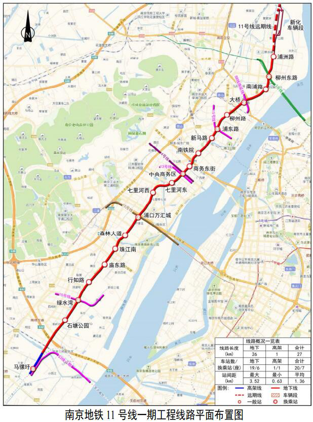 南京地鐵11號線一期工程南起馬騾圩站,北至浦洲路站,全線設(shè)車站20座,其中換乘站7座。此外,11號線一期將采用A型車、6輛編組,設(shè)計(jì)時(shí)速80km/h。