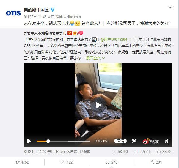 2018年8月22日,奧的斯電梯官方微博首先發(fā)聲,表示經(jīng)查該男子并不是奧的斯員工。