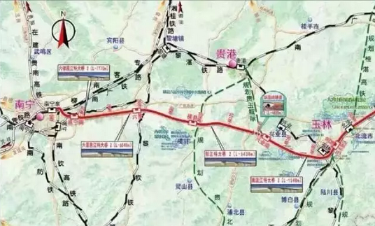新建南深高鐵南寧至玉林段位于廣西壯族自治區(qū)境內(nèi),連接北部灣城市群與桂東南城鎮(zhèn)群,線路西起自治區(qū)省會(huì)南寧市,向東經(jīng)南寧市邕寧區(qū)、六景工業(yè)園至橫縣,行經(jīng)玉林市興業(yè)縣、福綿區(qū)至本線終點(diǎn)玉林市,線路長(zhǎng)度210.04千米,全線共設(shè)車站7座。速度標(biāo)準(zhǔn)為250公里/小時(shí)。南寧至玉林城際鐵路,計(jì)劃南寧東站引出,從城市南側(cè)引入玉林北站。