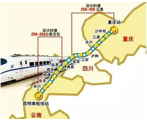 渝昆高鐵線路全長(zhǎng)約718公里,總投資1172.4億元。重慶段約118公里,設(shè)計(jì)時(shí)速為350公里。線路走向:重慶主城—江津—永川—瀘州—宜賓—昭通—昆明。設(shè)立18個(gè)站點(diǎn):重慶西站、江津北站、永川南站、瀘州站、南溪站、宜賓站、高縣站、筠連站、鹽津南站、彝良北站、昭通東站、迤車站、會(huì)澤站、卡竹站、尋甸站、嵩明站、長(zhǎng)水機(jī)場(chǎng)站、昆明南站。重慶至宜賓段建設(shè)工期4年,宜賓至云南段建設(shè)工期6年。