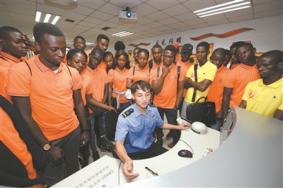 尼日利亞新入學(xué)留學(xué)生在西安動(dòng)車段高鐵仿真實(shí)訓(xùn)基地參觀。