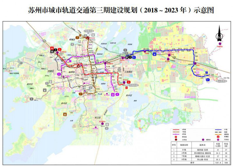 蘇州市城市軌道交通第三期建設規(guī)劃(2018~2023年)建設6號線、7號線、8號線和S1線等4個項目,總長度137.4公里。項目建成后,蘇州市將形成353.4公里的軌道交通網絡。