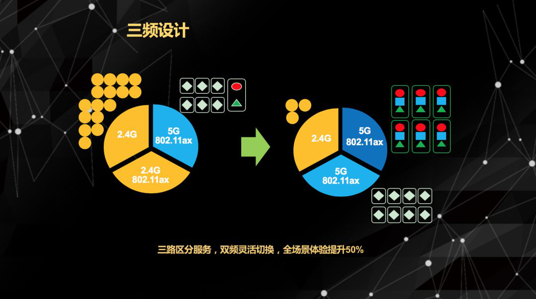 802.11ax標(biāo)準(zhǔn)利用OFDMA技術(shù),加之同時支持2.4GHz和5GHz頻段,創(chuàng)造出更多可用的數(shù)據(jù)通道。用戶無論使用802.11ax,還是802.11ac Wave2、802.11ac Wave1,甚至是802.11n的終端,在多個射頻的環(huán)境下,使用效果都將獲得顯著提升。