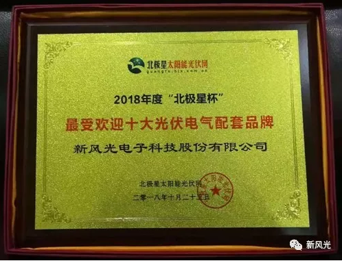 2018年10月25日,北極星“光伏+”研討會(huì)暨2018“北極星杯”十大最受歡迎光伏品牌頒獎(jiǎng)典禮在北京盛大開(kāi)啟。新風(fēng)光榮獲2018“北極星杯”最受歡迎十大光伏電氣配套品牌。