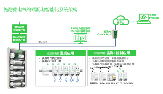 該方案由智能FD(終端配電)元件、智能網(wǎng)關(guān)模塊、應(yīng)用及管理平臺三部分構(gòu)成。智能FD元件采用PowerTag 無線電能測量模塊、iCT/iTL/Reflex/iOF SD/RCA遠程控制附件等設(shè)備;智能網(wǎng)關(guān)模塊采用Acti9 PowerTag Link SI D智能網(wǎng)關(guān)模塊D型、Acti9 PowerTag Link SI B智能網(wǎng)關(guān)模塊B型、智能物聯(lián)網(wǎng)關(guān)模塊、智能物聯(lián)網(wǎng)關(guān)(連接EMOP)等;應(yīng)用及管理平臺采用的是PME電能管理系統(tǒng)、PSO電力監(jiān)控系統(tǒng)、EBO/BMS樓宇管理系統(tǒng)、千里眼運維專家(終端配電版本)、千里眼運維專家(PC端和手機終端應(yīng)用)等。