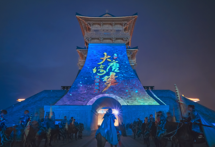 而在古城襄陽(yáng),唐城影視基地內(nèi),耗資2.5億的《盛世唐城之大唐倚夢(mèng)》,由近400名專(zhuān)業(yè)演員依托40萬(wàn)平方米仿唐建筑群為背景的大型嵌入行進(jìn)式全景秀每晚上演。作為《盛世唐城之大唐倚夢(mèng)》的主要影像設(shè)備,Vivitek(麗訊)共采用了38臺(tái)亮度為18,000 流明的激光工程投影機(jī)DU9800Z,分布在花萼樓、虹橋、朱雀門(mén)、德勝門(mén)等著名長(zhǎng)安城景點(diǎn),其中花萼樓共使用12臺(tái)Vivitek(麗訊)DU9800Z激光工程投影機(jī),虹橋、朱雀門(mén)和德勝門(mén)則分別使用了2臺(tái)、20臺(tái)和4臺(tái),通過(guò)拼接、融合的方式投射出震撼清晰的3D影像,完美詮釋了裸眼建筑3D投影的震撼效果。