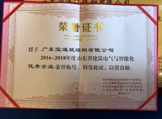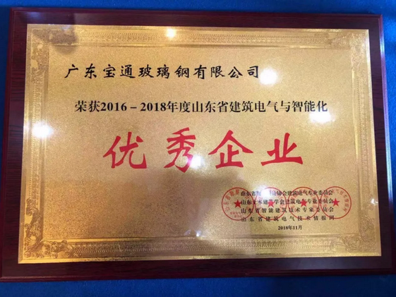 在本次年會上,廣東寶通玻璃鋼有限公司全方位展示了寶通BWFRP管道的優(yōu)越性能,獲得了與會專家和電力設(shè)計師們的高度認(rèn)可和稱贊。一直以來,在山東省“三會一網(wǎng)”的帶領(lǐng)和支持下,廣東寶通玻璃鋼有限公司助力電網(wǎng)更加安全、穩(wěn)定地運行,以創(chuàng)新解決行業(yè)難題,BWFRP管道的初衷就是推動地下管線行業(yè)的發(fā)展與城市的快速發(fā)展步調(diào)一致,積極為電力電網(wǎng)的安全穩(wěn)定運行貢獻(xiàn)一份力量。在本屆年會上廣東寶通玻璃鋼有限公司榮獲2016—2018年度山東省建筑與電氣智能化“優(yōu)秀企業(yè)”榮譽稱號,這既是對寶通BWFRP管道的認(rèn)可也是一種激勵,今后我們將更加努力。