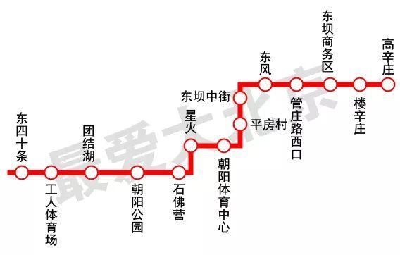東四十條站、工人體育場站、團結(jié)湖站、朝陽公園站、石佛營站、星火站、朝陽體育中心站、平房村站、東壩中街站、東風(fēng)站、管莊路西口站、東壩商務(wù)區(qū)站、樓辛莊站、高辛莊站