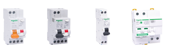 施耐德電氣A型漏電保護斷路器(從左至右分別為:Acti 9、Multi 9、Easy 9以及Resi 9系列)