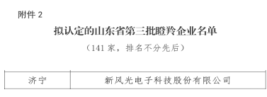 近日,山東省工信廳對(duì)山東省第三批瞪羚企業(yè)名單進(jìn)行公示,新風(fēng)光電子科技股份有限公司(以下簡稱新風(fēng)光公司)榜上有名。