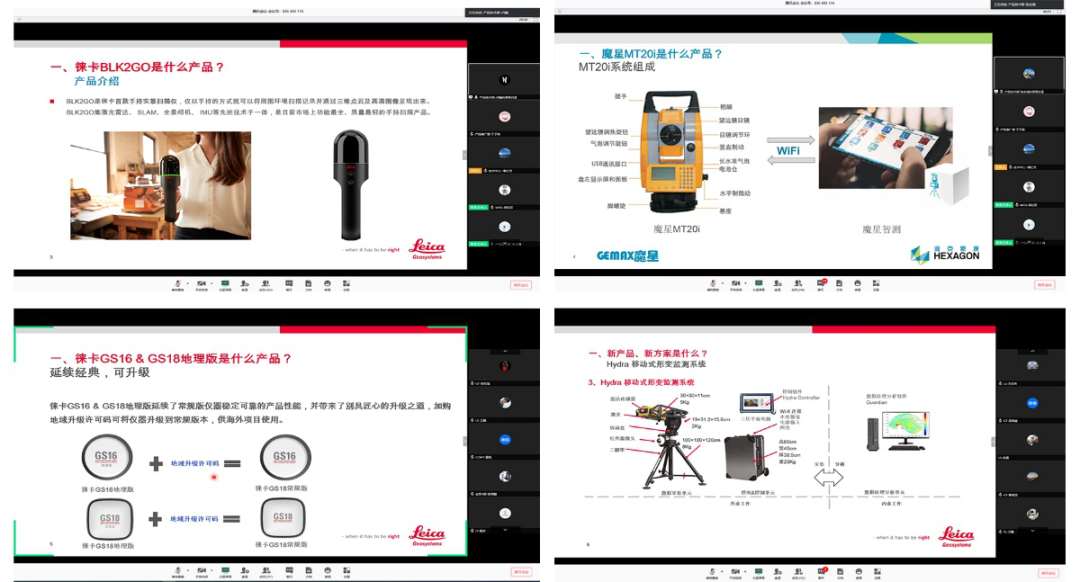 在會(huì)議中,徠卡測(cè)量各渠道工作人員對(duì)新一年公司政策變化及部門支持政策進(jìn)行了深入解讀,對(duì)合作伙伴們2020年的行動(dòng)計(jì)劃及重點(diǎn)工作進(jìn)行詳細(xì)部署。 3月26日下午,產(chǎn)品與應(yīng)用論壇和本地化需求溝通會(huì)也紛紛在線上舉行,各分會(huì)場(chǎng)報(bào)名火爆。徠卡測(cè)量技術(shù)人員雖然分散全國各地,有的甚至還在居家隔離中,但是他們依舊為此次會(huì)議做了充分的準(zhǔn)備,他們化身“網(wǎng)絡(luò)主播”,在線上為大家講解徠卡測(cè)量的新產(chǎn)品、新方案。
