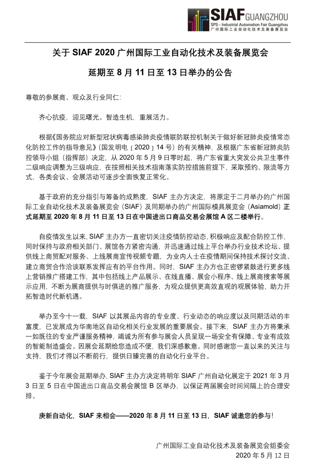 廣州國際工業(yè)自動(dòng)化技術(shù)及裝備展覽會(huì) (SIAF),以及同期舉行的廣州國際模具展覽會(huì) (Asiamold) 主辦方今天宣布原定于2 月舉行的展會(huì)將于2020年8月11至13日重新展開,并將再次在廣州中國進(jìn)出口商品交易會(huì)舉行。作為德國紐倫堡SPS – Smart Production Solutions展會(huì)的姊妹展,SIAF是華南地區(qū)智能自動(dòng)化解決方案的首要樞紐之一,而Asiamold則涵蓋了前沿的模具制造、3D打印、壓鑄及金屬加工技術(shù)。