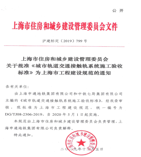近日,《城市軌道交通接觸軌系統(tǒng)施工驗收標(biāo)準(zhǔn)》(DG/TJ08-2306-2019)(以下簡稱《標(biāo)準(zhǔn)》)正式由上海市住房和城鄉(xiāng)建設(shè)管理委員會批準(zhǔn),于2020年5月1日起實施。這是繼中鐵七局集團有限公司主編的江蘇省《城市軌道交通接觸網(wǎng)系統(tǒng)工程質(zhì)量驗收規(guī)范》頒布實施之后,華東地區(qū)又一部地方建設(shè)標(biāo)準(zhǔn)被批準(zhǔn)實施。