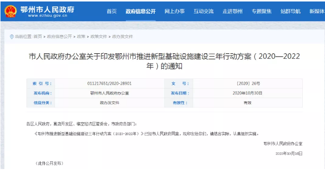近日,鄂州市人民政府官網(wǎng)發(fā)布了《市人民政府辦公室關(guān)于印發(fā)鄂州市推進(jìn)新型基建設(shè)施三年行動(dòng)方案(2020-2022)的通知》,根據(jù)內(nèi)容顯示: