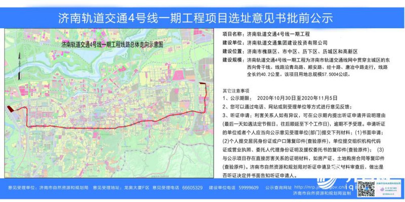 而地鐵4號線一期工程是貫穿濟南主城區(qū)的東西向骨干線。線路沿青島路、順安路、經(jīng)十路、唐冶中路走行,全長40.2公里。橫跨濟南市槐蔭區(qū)、市中區(qū)、歷下區(qū)、高新區(qū)。公示期為2020年10月30日-11月5日。