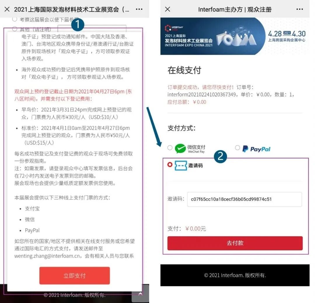 關(guān)注“Interfoam發(fā)泡材料展”公眾號,回復“元宵快樂”獲取免費邀請碼,并復制!在菜單欄點“觀眾”-“觀眾預登記”,進入資料填寫界面。