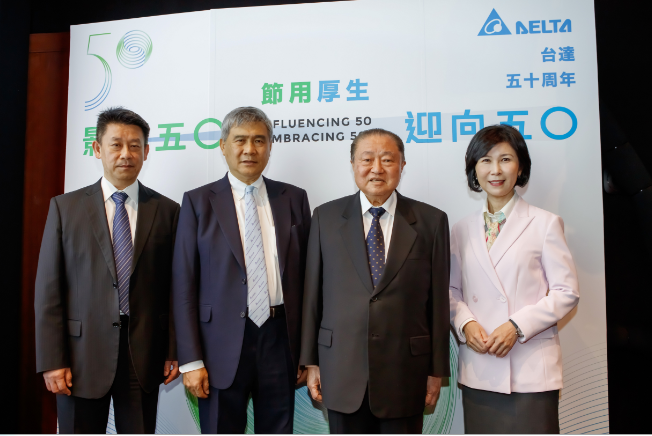 臺達(dá)執(zhí)行長鄭平(左一)、董事長海英俊 (左二)、創(chuàng)辦人鄭崇華 (右二)及品牌長郭珊珊共同出席臺達(dá)50周年記者會