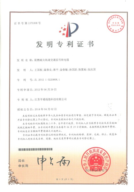此證書是亨通線纜繼“一種數(shù)據(jù)傳輸汽車線用PVC電纜料”、“一種數(shù)據(jù)電纜用耐水阻燃PVC電纜料及其制備方法”及“阻燃耐火軌道交通信號軟電纜”三項發(fā)明專利之后的又一項重要發(fā)明專利,也是2014年度的第四項發(fā)明專利。