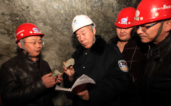 2、東北勘測(cè)設(shè)計(jì)院東北分公司總監(jiān)周克(左二)、十八局集團(tuán)隧道公司吉林引松項(xiàng)目經(jīng)理陳立和(右二)、常務(wù)副經(jīng)理魏代軍(右一)、副經(jīng)理田玉分(左一)在掌子面現(xiàn)場(chǎng)辦公(魏代奇 攝)