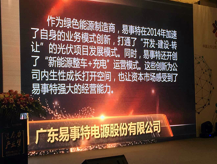 評委會認(rèn)為,作為全球綠色能源制造商,易事特在2014年加速了自身的業(yè)務(wù)模式創(chuàng)新,打通了“開發(fā)-建設(shè)-轉(zhuǎn)讓”的光伏項目發(fā)展模式。同時易事特還開創(chuàng)了“新能源整車+充電”運營模式,這些創(chuàng)新為公司內(nèi)生性成長打開空間,也讓資本市場感受到了易事特強大的經(jīng)營能力。