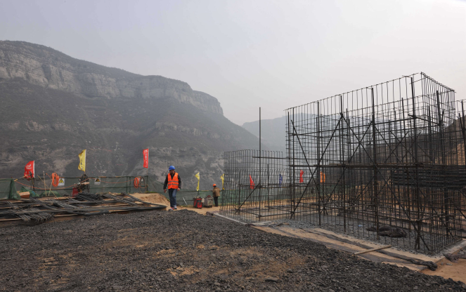 中鐵一局蒙華鐵路龍門(mén)大橋進(jìn)行鋼筋綁扎。牛榮健 攝