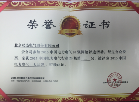 2016年4月15日, 雙杰電氣應(yīng)邀參加2015中國電力電氣年度品牌20強評選頒獎活動, 本次評選活動通過互聯(lián)網(wǎng)+形式推廣,以微信形式投票產(chǎn)生, 整個網(wǎng)絡(luò)投票活動歷時兩個月,經(jīng)過緊張激烈的公眾投票,于3月15日完美收官,北京雙杰電氣股份有限公司獲得第三名。