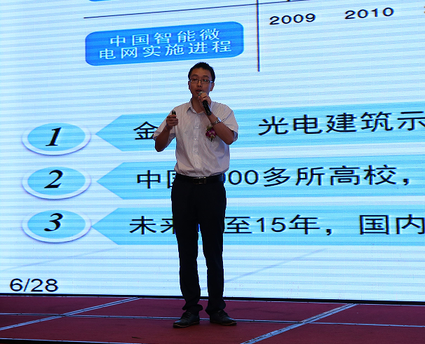 易事特集團(tuán)研發(fā)中心張濤博士以“智能微電網(wǎng)及光伏發(fā)電系統(tǒng)”為主題進(jìn)行了分享,分析智能微電網(wǎng)全球市場(chǎng)規(guī)模及發(fā)電量,展示易事特智能微電網(wǎng)示范工程的應(yīng)用成果,并詳細(xì)介紹了易事特光伏精準(zhǔn)扶貧的整體解決方案及應(yīng)用情況。