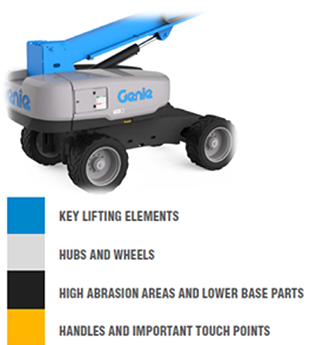 此次Genie ?S?-80自行式直臂型高空作業(yè)平臺的全新設(shè)計語言主要體現(xiàn)在底盤和外殼兩個部分。首先,底盤和外殼的邊緣改為使用代表穩(wěn)固和可靠的黑色。全新設(shè)計的外殼形狀可以減緩意外沖擊,頂面設(shè)計還有助于防止雜物和水沉積,延長外殼的使用壽命,使其更加堅固耐用與美觀。產(chǎn)品設(shè)計的統(tǒng)一性能夠使產(chǎn)品脫穎而出、更具競爭力。不僅如此,外殼上向下凸起的邊緣設(shè)計是吉尼獨一無二的“視覺標(biāo)志”。