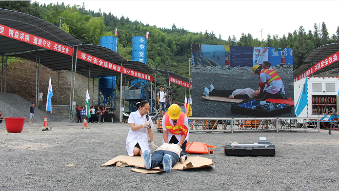 正在大樹(shù)村2號(hào)大橋5號(hào)墩蓋梁模板拆除施工的作業(yè)工人黃某未將安全帶正確固定,不慎從5號(hào)墩蓋梁操作平臺(tái)“墜落”。應(yīng)急指揮部立即啟動(dòng)高處墜落應(yīng)急救援預(yù)案,迅速展開(kāi)救援工作。在醫(yī)療人員的接應(yīng)下送往急救車,由于搶救方案正確,應(yīng)急反應(yīng)及時(shí),方法得當(dāng),3名傷員經(jīng)醫(yī)院檢查救治,均無(wú)生命危險(xiǎn)。三江縣中醫(yī)院急救專家趙紅芬在演練現(xiàn)場(chǎng)進(jìn)行了模擬真人演練,一面講解一面做示范。