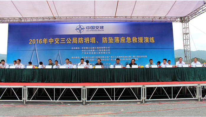 (記者 ??? 通訊員 祁云翠)6月24日,中交三公局在一公司廣西三柳1標(biāo)項(xiàng)目大樹(shù)村隧道口舉行了2016年隧道坍塌事故及高處墜落事故應(yīng)急演練,這是近年來(lái)三公局舉行的最大規(guī)模的應(yīng)急救援演練活動(dòng)。局副總經(jīng)理張耀強(qiáng)、安全總監(jiān)侯建剛出席并觀摩演練。廣西三江侗族自治縣公安消防大隊(duì)、三江縣侗族自治縣紅十字會(huì)為本次應(yīng)急演練聯(lián)動(dòng)單位參加演練,廣西柳州電視臺(tái)進(jìn)行了全程播報(bào)。
