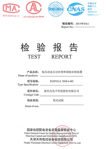 本次試驗(yàn)依據(jù)DL/T1216-2013《配電網(wǎng)靜止同步補(bǔ)償裝置技術(shù)規(guī)范》以及企業(yè)標(biāo)準(zhǔn)Q/0830SFD013-2013《FGSVG系列低壓動(dòng)態(tài)無(wú)功補(bǔ)償和諧波治理裝置》等標(biāo)準(zhǔn)的要求,對(duì)該產(chǎn)品進(jìn)行了一般檢查、絕緣性能、遠(yuǎn)程控制、總諧波畸變率、保護(hù)、運(yùn)行、溫升、噪聲、電磁兼容等共18項(xiàng)測(cè)試,試驗(yàn)全部合格。