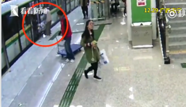 12月29日上午9點(diǎn)50分,在廣西南寧,一輛地鐵列車抵達(dá)民族廣場(chǎng)站,就在車門即將關(guān)閉時(shí),一名男子推著一輛嬰兒車沖了上去,被關(guān)閉的車門給夾住了。