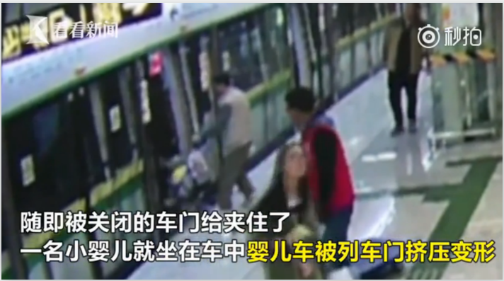 一輛地鐵列車抵達(dá)民族廣場(chǎng)站,就在車門即將關(guān)閉時(shí),一名男子推著一輛嬰兒車沖了上去,被關(guān)閉的車門給夾住了。