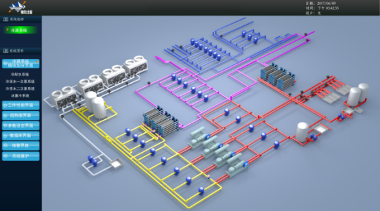 能源管理系統(tǒng)通過與關(guān)聯(lián)預(yù)測控制系統(tǒng)通訊,實(shí)現(xiàn)數(shù)據(jù)傳輸與命令控制,具備一鍵啟動(dòng)、各種參數(shù)和狀態(tài)報(bào)警、數(shù)據(jù)圖表顯示、數(shù)據(jù)分析、歷史數(shù)據(jù)存儲(chǔ)和輸出、數(shù)據(jù)報(bào)表打印等功能。系統(tǒng)界面整潔、大方、美觀,背景圖根據(jù)項(xiàng)目實(shí)際三維圖設(shè)計(jì)而成,直觀準(zhǔn)確的顯示了冷熱源系統(tǒng)的各個(gè)設(shè)備部署、設(shè)備運(yùn)行狀態(tài)、管道連接和水流顯示等情況,主要的數(shù)據(jù)參數(shù)直接顯示于界面上,通過鼠標(biāo)或觸屏操作就可以實(shí)現(xiàn)各設(shè)備的詳細(xì)狀態(tài)顯示、開關(guān)控制和參數(shù)設(shè)定等,操作便捷。本系統(tǒng)具有靈活的系統(tǒng)構(gòu)架,用戶可在中控室遠(yuǎn)程操作控制,也可在機(jī)房后臺(tái)進(jìn)行維護(hù),互不干擾。